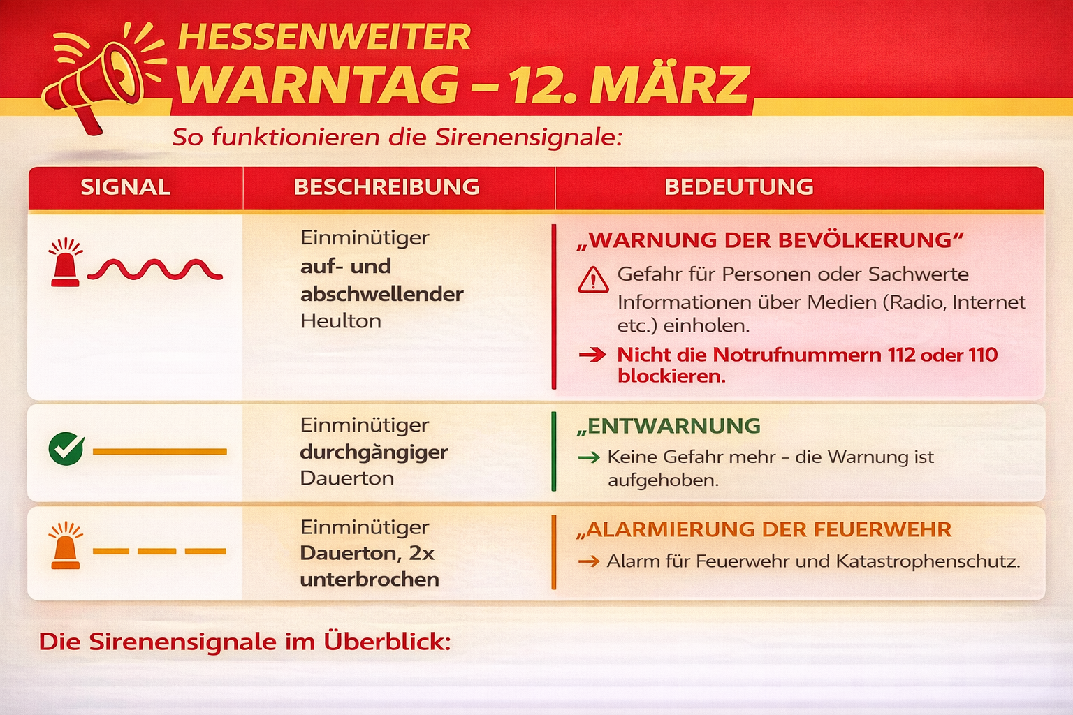 Am 12. März findet in Hessen der landesweite Warntag statt. An diesem Tag werden verschiedene Warnsysteme getestet, darunter Sirenen, Warn-Apps und Cell Broadcast. Ziel ist es, die technischen Systeme zu überprüfen und die Bevölkerung mit den Warnsignalen vertraut zu machen.